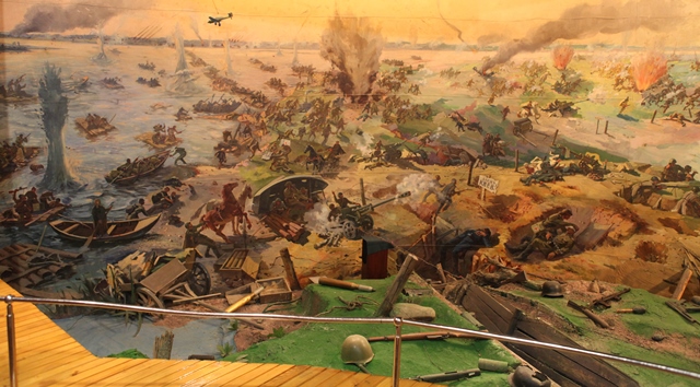 Особливе місце в експозиції філії НВІМУ – музею «Героїв Дніпра» займає діорама «Подвиг на Дніпрі». За допомогою спеціальної електронної апаратури вона розповідає про форсування ріки у вересні і визволення Києва в листопаді 1943 р. Її живописне полотно має площу 68 м2, а площа предметного плану – 38 м2. Відвідувачі перед тим як увійти до демонстраційного залу проходять через «землянку» – копію тої, що була споруджена саперами на березі Дніпра, звідки командуючий 38 армією генерал – полковник К.С. Москаленко віддавав накази військам про визволення Києва.