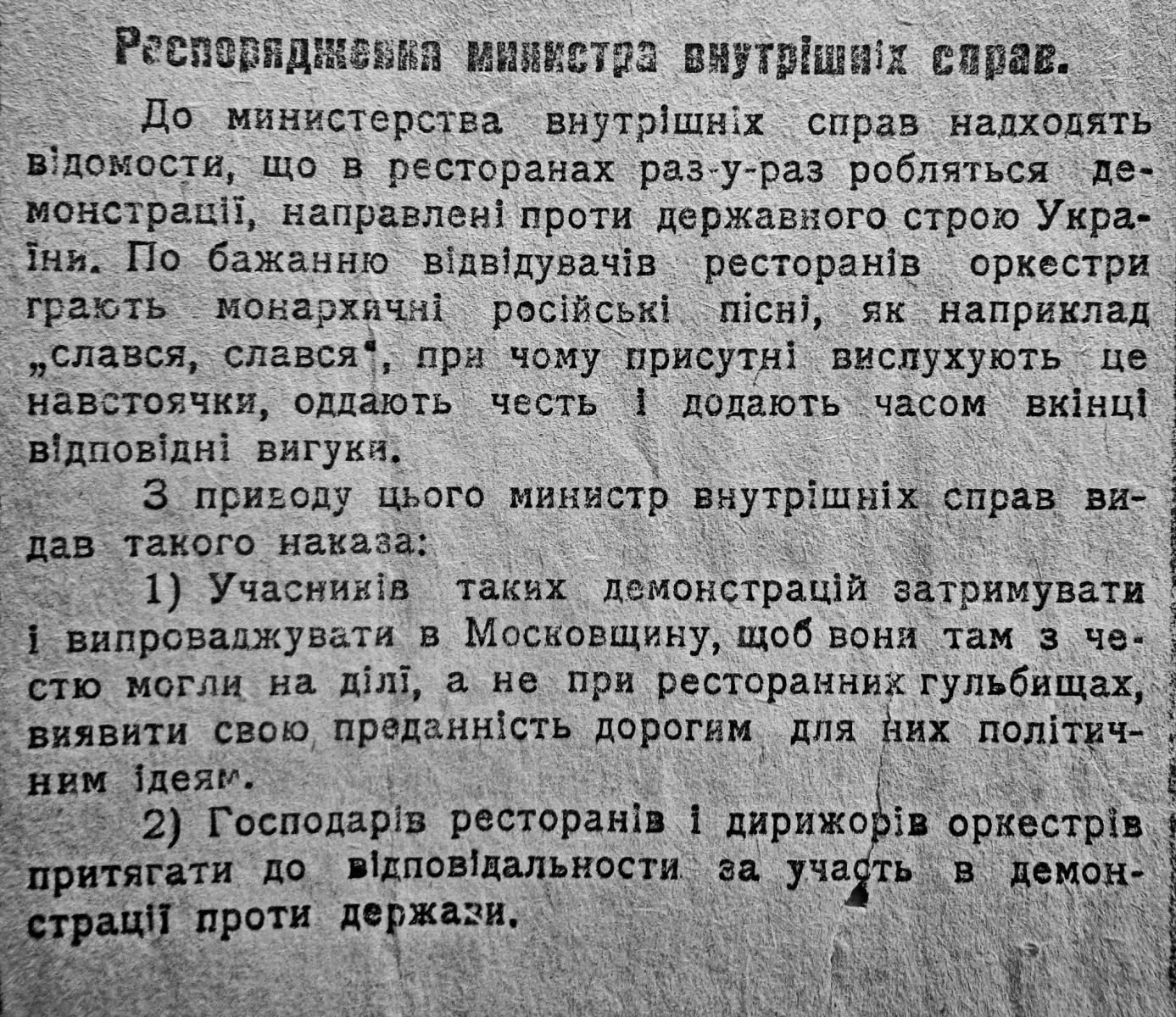 30 серпня 1918 р. у київських газетах з’явилось повідомлення, що міністр внутрішніх справ Української Держави наказав виконавців російських монархічних пісень «випроваджувати в Московщину». Чи виконувався цей наказ насправді – питання для дослідження істориків. Але тоді, у 1918 р., ця історія наробила галасу і примусила російських патріотів (aka «хороших рускіх»), що ховались в Україні від кровожерливих російських більшовиків, «прикрутити» музику.